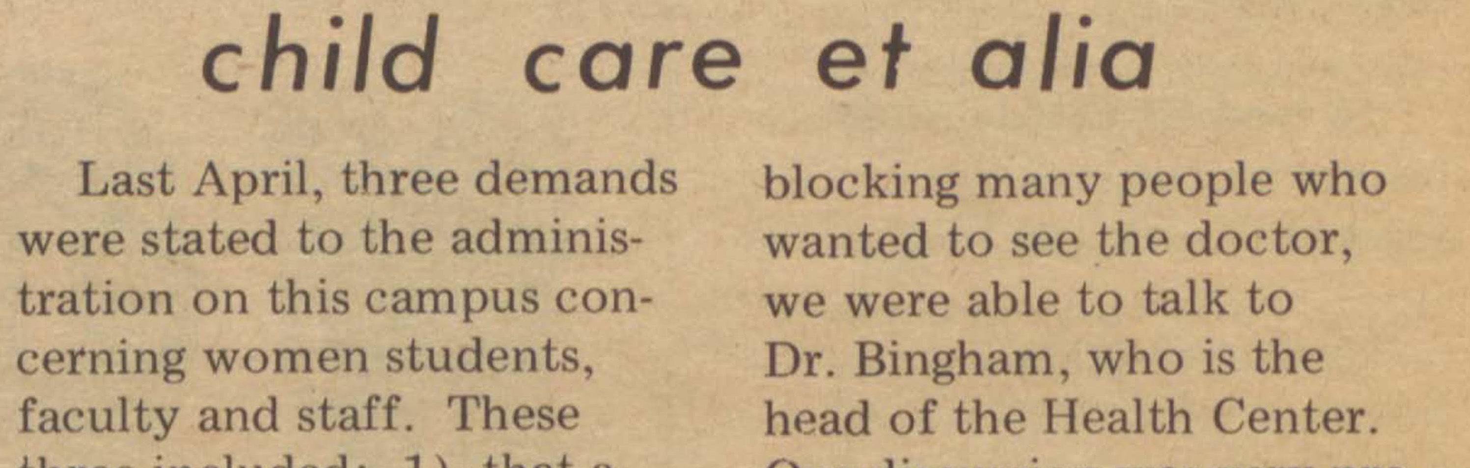 The final page of Focus: Women issue contained an essay titled “Child Care et allia.” This article details the limited resources available for women at OU. The author discusses the limited gynecological help, unreasonably priced childcare (69 cents per hour), and the male run career services. This exposé concludes with a call for Oakland University women to unite in a sisterhood to give women equal rights to men at OU.