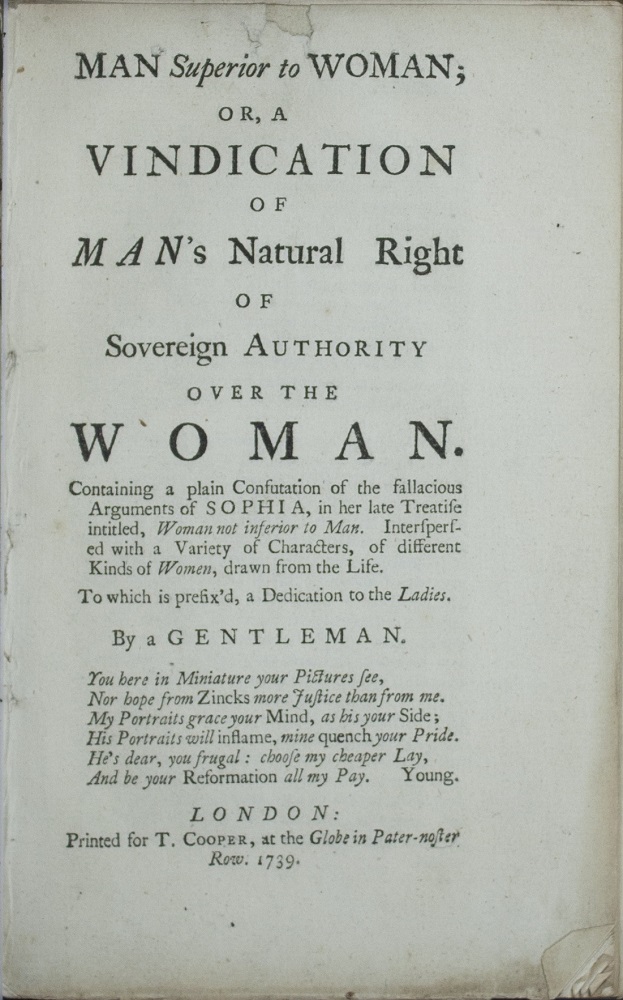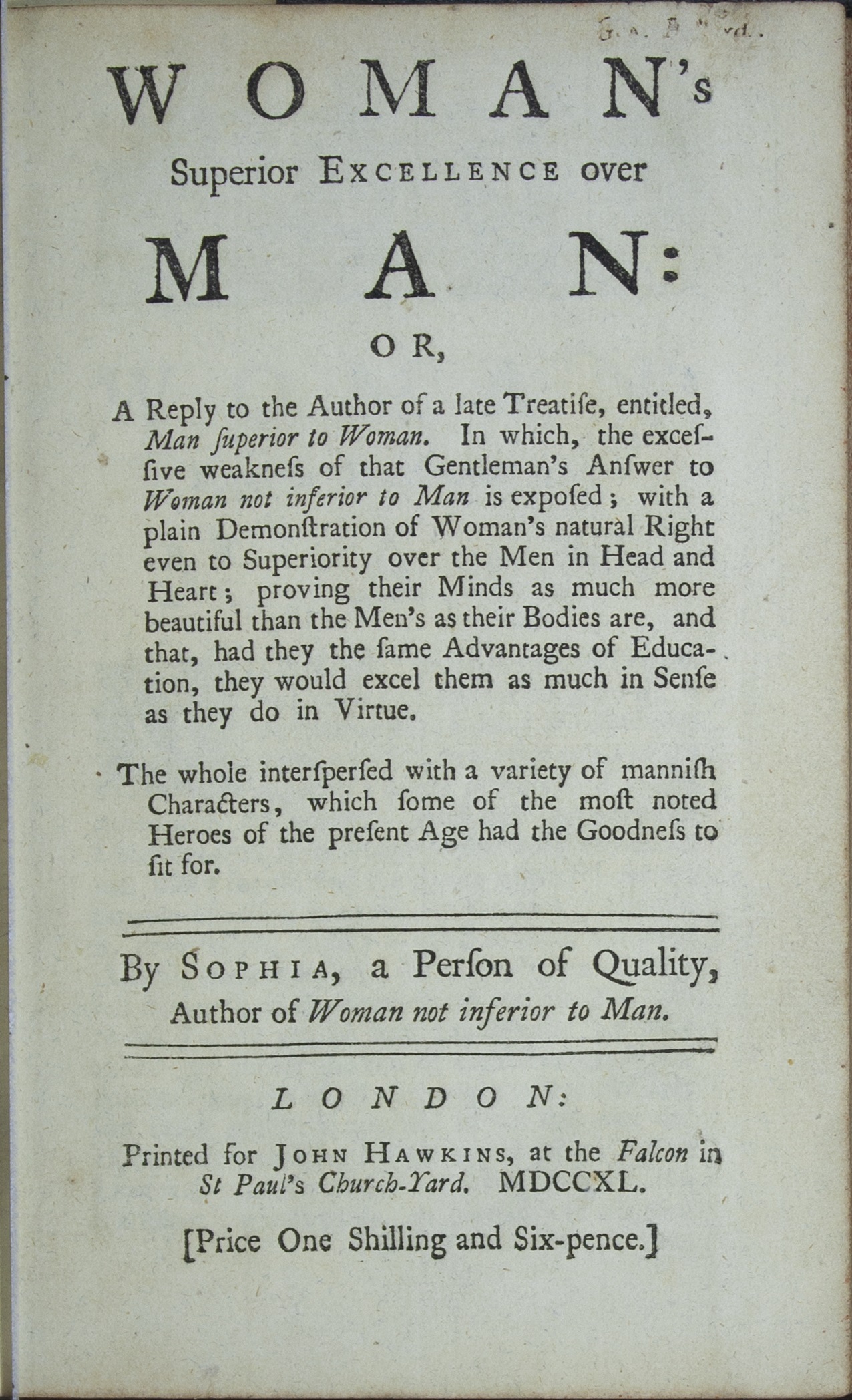 Soon a response entitled "Man Superior to Woman" appeared, to which Sophia responded with "Woman's Superior Excellence Over Men" (1740).