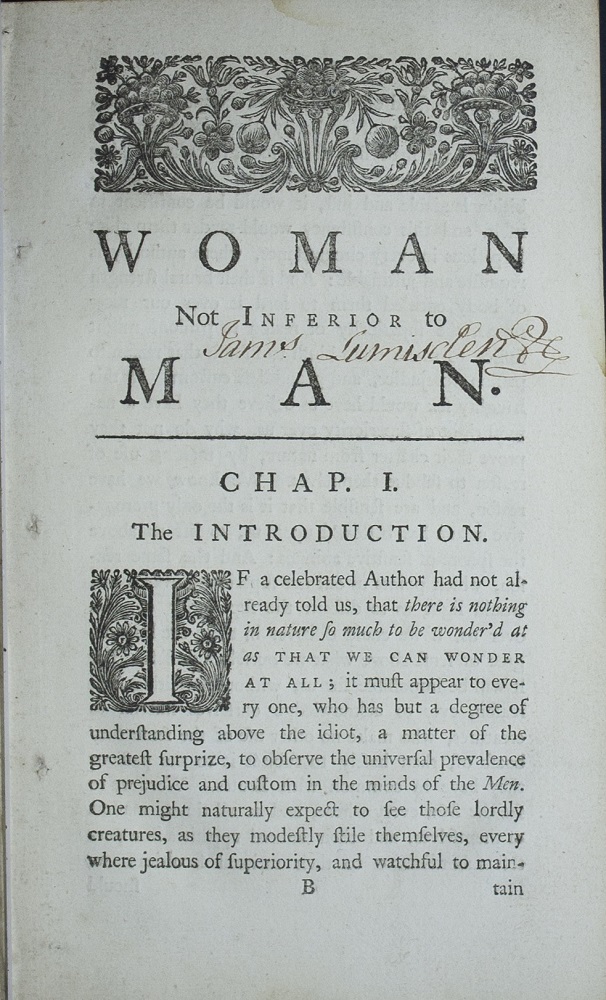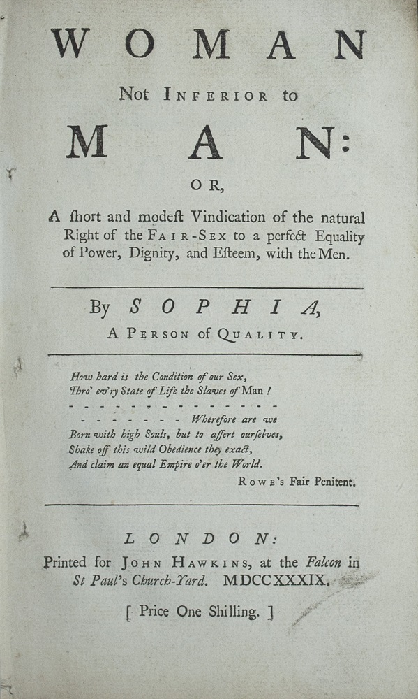On November 22, 1739 she published "Woman Not Inferior to Man: Or A Short and Modest Vindication of the Natural Right of the Fair-Sex to a Perfect Equality of Power, Dignity, and Esteem, with the Men."