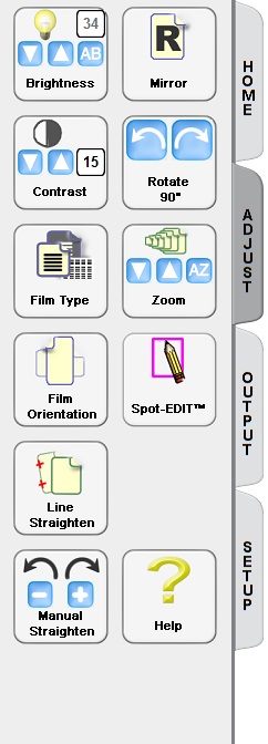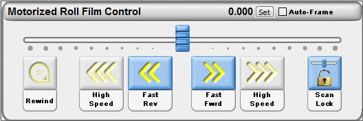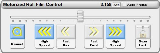 To use the Motorized Roll Film Control, simply click and drag the blue slider to the left or right to advance or retreat the film on the roll, repectively. More information about the Motorized Roll Film Control can be found in the 'Common Image Adjustments' Section.