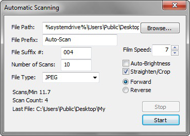 Automatic Scanning will bring up the dialog above and enables you to save multiple images from a 35mm film roll automatically. You can select anywhere from 1 image to the entire roll.