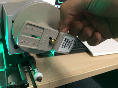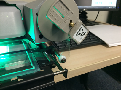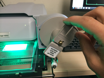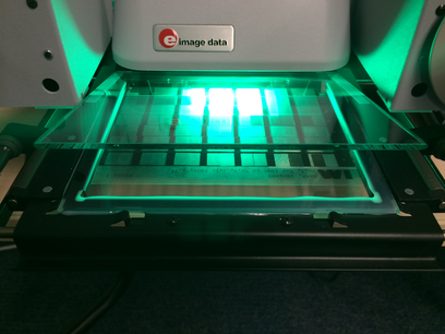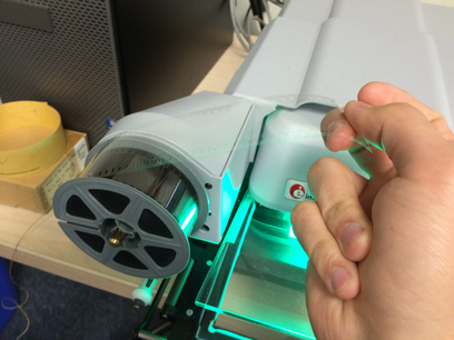 After selecting the 'Micro Opaque' button on the PowerScan Wizard, a green light should illuminate from the ScanPro 3000 machine. Pull out on the tray as far as it will go, making sure the glass is between the two arms of the film spool holder. The top of the glass tray should separate from the bottom.