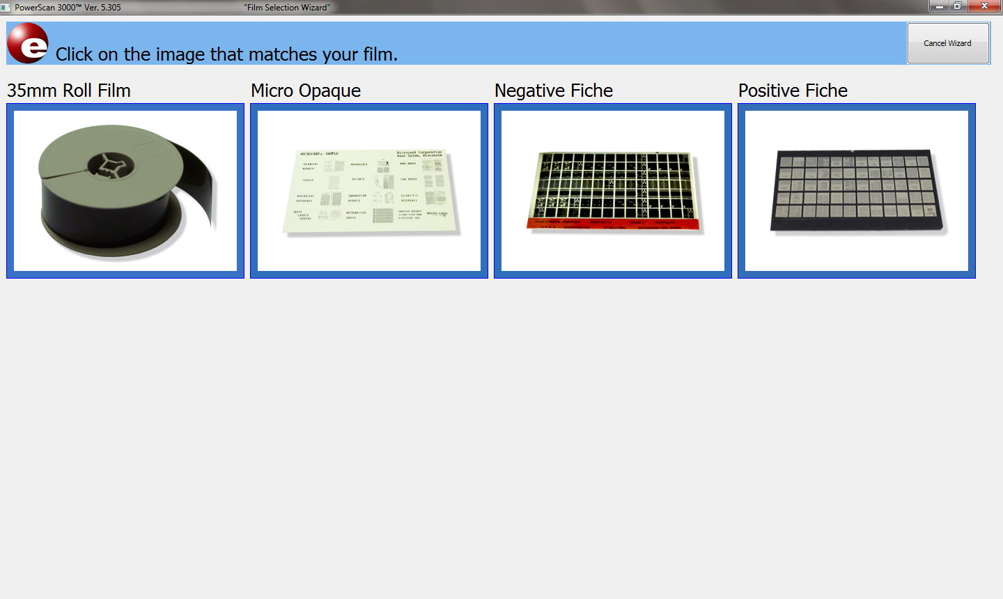 This is the PowerScan Wizard that appears when you start the PowerScan 3000 software. Click on the icon that looks like the microform you will be viewing.